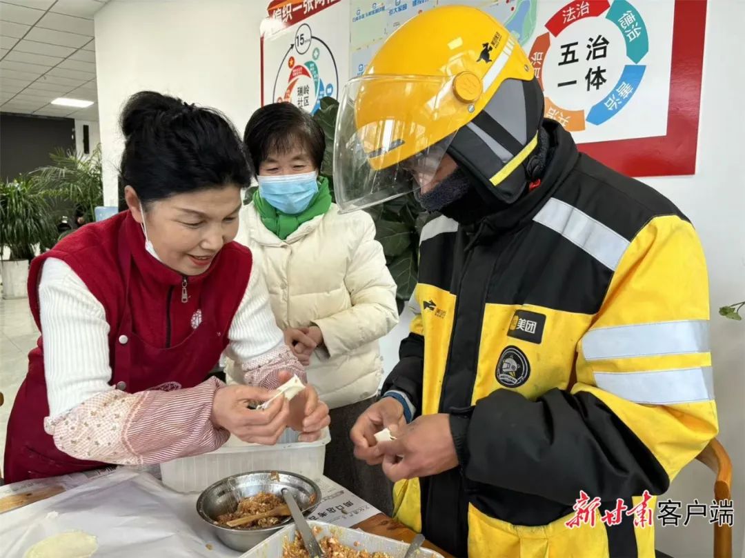 12月19日下午,在位于蘭州新區(qū)京都商業(yè)廣場(chǎng)的新興領(lǐng)域區(qū)域性黨群服務(wù)中心,外賣配送員、網(wǎng)約車司機(jī)、快遞員等新就業(yè)群體和社區(qū)工作人員一起,包餃子、吃餃子,其樂(lè)融融。
